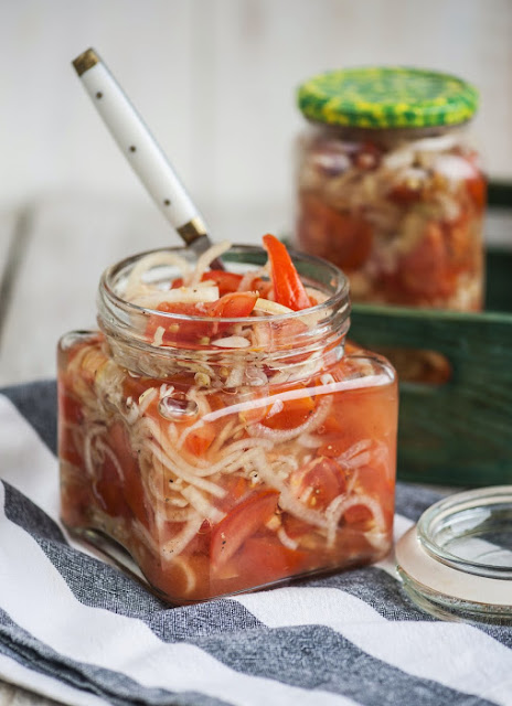 Esiteks maitsevad tomatid siis kõige magusamalt ja mahlasemalt ning siia sobivad ainult sellised küpsed, mitte talvehooajale omased krõmpsukad. Teiseks valmib hooajal lühikese ajal jooksul liiga palju vilju korraga, nii et igapäevaselt tarbida ei jõua ning naabrid-sõbrad on ka juba varustatud. Just siis tuleb kõige maitsvamad koos sibulaga purki pista ja mõnus praekõrvane vürtsikas salat on võtta, eriti hästi maitseb grillroogade kõrvale. Üle talve ei ole mõtet säilitada, pigem tarvitada paari kuu jooksul, ikkagi värske ja meenutab suve.